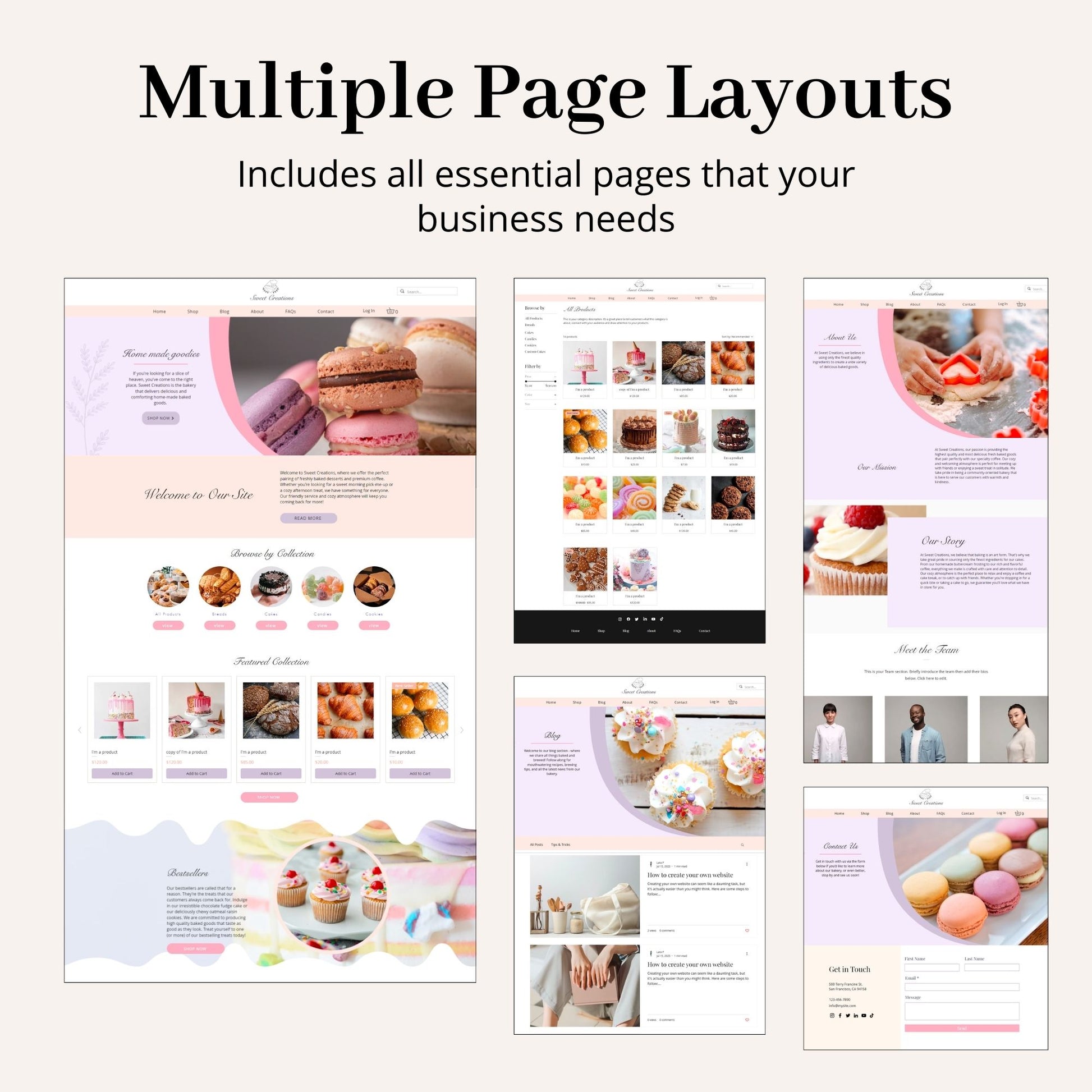 This pastel pink and purple Wix website template is perfect for bakeries, candy shops, dessert boutiques, cupcake businesses, and homemade treat sellers. Built with an online store, blog, FAQs, and customer pages, it’s ideal for selling cakes, cookies, pastries, chocolates, candies, and other sweet delights online.
