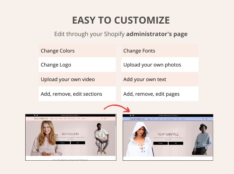 With this template, you'll be able to edit your colors, content, logo and photos all through your Shopify administrator page.