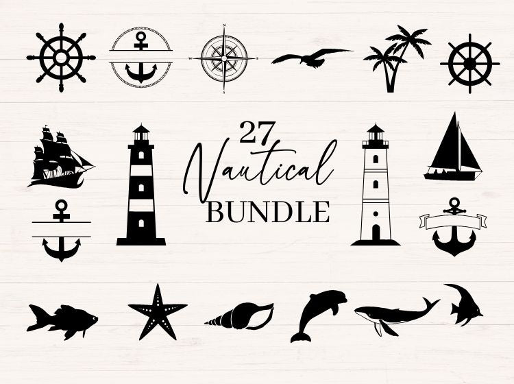 This package contains 27 designs of nautical themed graphics. It is ideal for crafting projects with a beach, sailing or coastal theme, and can be used for Cricut, Silhouette, or sublimation design projects. The bundle includes images such as lighthouses, ship, boat, compass, anchor, ship wheel, albatross, dolphin, whale, fish, starfish, seashell, palm trees