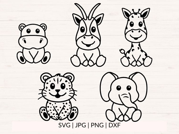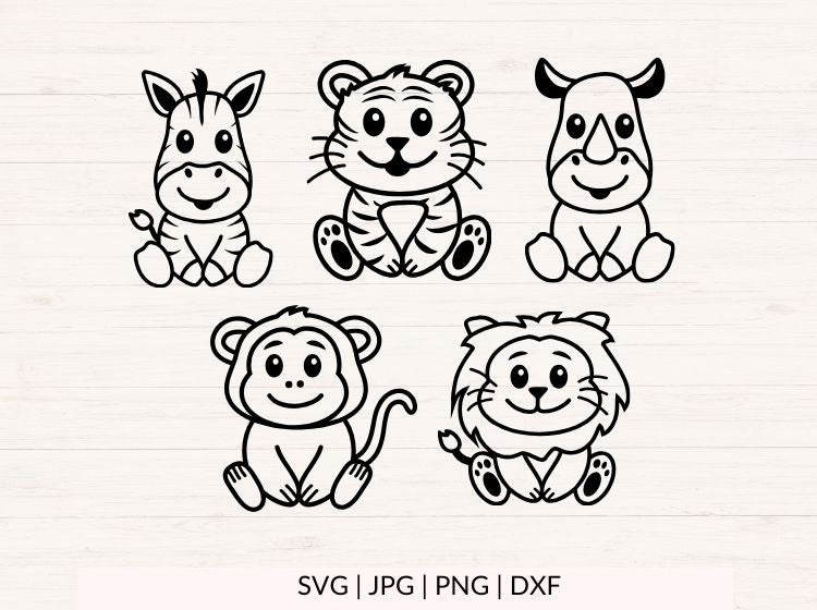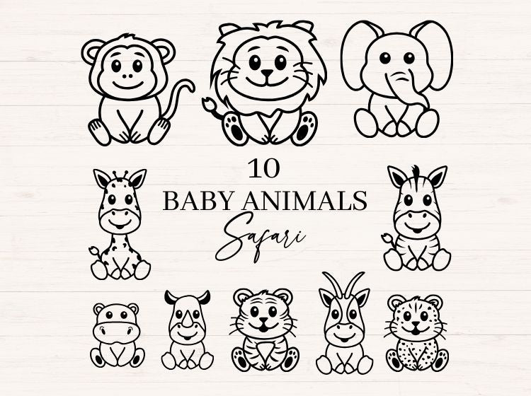 This is a set of ten (10) hand drawn cute baby animals. This set includes animals that are normally found in the jungle or the safari. It includes: lion, giraffe, cheetah, rhino, zebra, monkey, hippo, gazelle, elephant, tiger