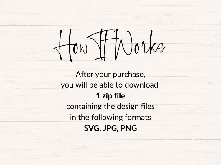 After your purchase, you will be able to download 1 zip file containing the design files in the following formats SVG, PNG, DXF
