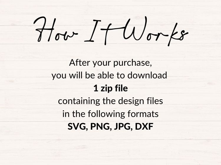 After your purchase, you will be able to download 1 zip file containing the design files in the following formats SVG, PNG, DXF